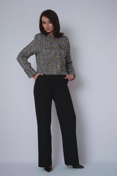 Dit grijs gemêleerde tweedjasje voegt meteen klasse en structuur toe aan elke outfit. De compacte stof en het verzorgde silhouet maken dit jasje tot een tijdloos item met een moderne touch.